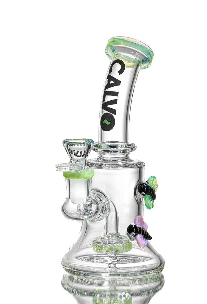 Un pequeño Bong estilo Rig, el cual tiene un hermoso diseño de dos abejas en su exterior, una rosada, y otra verde. Por dentro tiene un percolador wheel de 14 slits, el cual, junto con el agua, harán un burbujeo constante para filtrar el humo de cada calada.