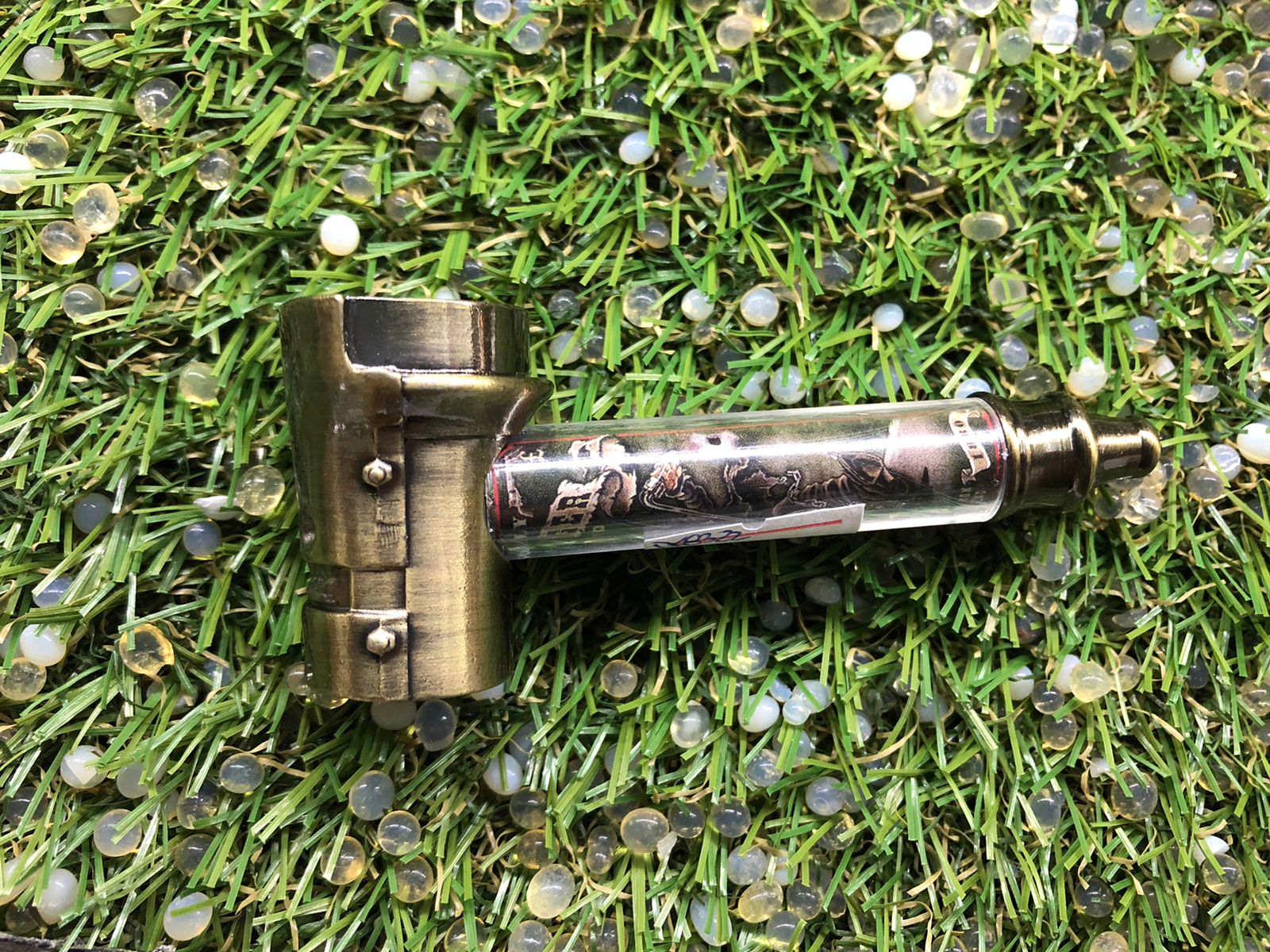 Pipa de 9cm de largo con quemador y cuerpo de metal y cobertura de platico con diseño, con gran espacio en su quemador desarmable para mejor limpieza